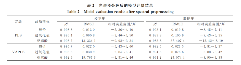 分别采用偏最小二乘法(PLS)、角度度量法(VAPLS)建立橄榄油酸价、过氧化值、亚麻酸等三个品质指标的分析模型。由图2可知,橄榄油样品的特征峰集中在8001800cm-128003000cm-1波段范围内,截取样本光谱该特征波段作为建模数据,分别通过一阶导(D1)、 二阶导(D2)、多元散射校正(MSC)、标准正态变换(SNV)等方法对已截取的光谱进行预处理,分别建立模型,其中经过一阶导处理后的光谱建立模型效果最佳,结果如表2所示。